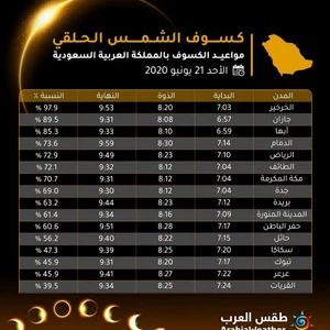 فيما يلي استعراض لتفاصيل بدء وذروة ونهاية كسوف الشمس المُنتظر يوم 21 يونيو في مُختلف مُدن المملكة، إضافة لنسبة حجب القمر للشمس: