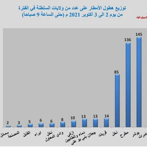 كميات الأمطار المُسجلة في عدد من الولايات في سلطنة عُمان يومي 2 و 3 اكتوبر حتى الساعة 9 صباحًا