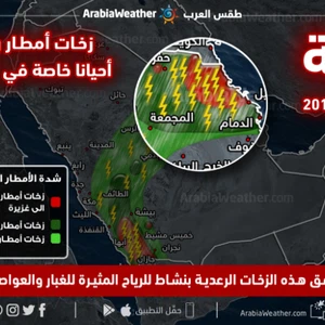 طقس العرب - سنان خلف - تُظهر آخر التقارير الجوية الصادرة عن مركز طقس العرب الإقليمي الى وجود إحتمالية عالية لتأثر الأجزاء الشرقية من المملكة تحديداً مع ساعات عصر ومساء اليوم الاحد وليلة الأحد/الاثنين بحالة من عدم الإستقرار الجوي قد تكون قوية في بعض المناطق، وستعمل بمشيئة الله على تساقط الامطار المتوسطة والغزيرة كما هو موضح من خلال الخارطة المرفقة.