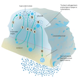 الصورة توضح مقطع عرضي لحبة البرد، فتظهر طبقات تشبه إلى حد كبير حلقات جذع شجرة مقطوع، تمثل كل طبقة رحلة العودة إلى منطقة قطرات المياه فائقة التبريد)