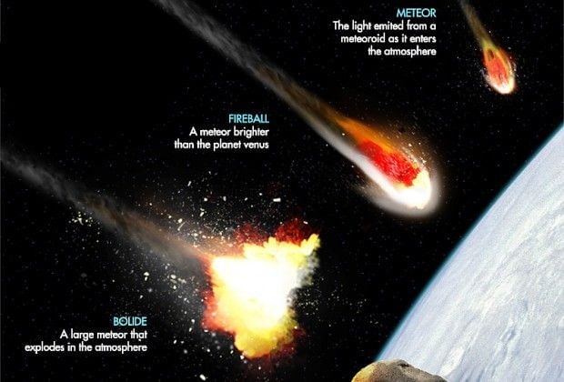 3. الشهب المتفجرة (Bolides): تعتبر الشهب المتفجرة أكثر إشراقًا وأضخم من الكرات النارية وغالبًا ما تنفجر في الغلاف الجوي، ويمكن سماع هذه الانفجارات وحتى الشعور بها من على سطح الأرض. يصنف بعض علماء الفلك الشهب المتفجرة على أنها كرات نارية تنتج صوتاً مدوياً أثناء انتقالها عبر الغلاف الجوي.