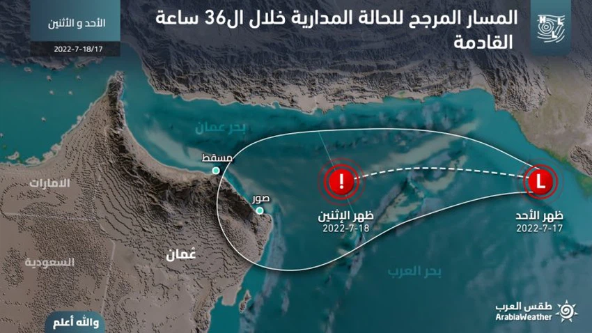 طقس العرب - يتبين من خلال آخر صور الأقمار الإصطناعية والبيانات بأن الحالة المدارية والمُصنفة كمنخفض مداري تتواجد إلى الشمال من بحر العرب وتُقدر سرعة الرياح السطحية حول المركز بحوالي 25 عقدة، ويبعد مركز المنخفض عن أقرب نقطة من سواحل السلطنة (رأس الحد) حوالي 550 كم. ويُعتبر نشوء منخفض جوي مداري في بحر العرب في هذا الوقت من العام من الأمور النادرة حيث تُشير السجلات المناخية المُتوفرة إلى أن أخر نظام جوي مداري متكامل تشكل في بحر العرب خلال شهر يوليو كان قبل حوالي 50 عاماً.