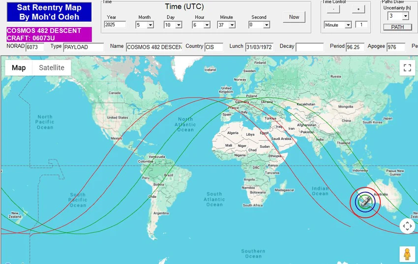 طقس العرب - توقع مركز الفلك الدولي سقوط المسبار الفضائي المعطل (Cosmos 482) على الأرض صباح اليوم السبت 10 مايو 2025م، وهو عبارة عن مسبار أطلقه الاتحاد السوفيتي عام 1972 وكان مصمما للتوجه نحو كوكب الزهرة والهبوط عليه، إلا أن المهمة فشلت في بدايتها وانتهى بها المطاف إلى أربع قطع تدور حول الأرض لمدة تزيد عن النصف قرن، ويعتقد أن الجسم الذي سيسقط على الأرض غدا هو كبسولة الهبوط، وحيث أنه جرم صناعي يدور حول الأرض، فهو يقع ضمن فئة الأقمار الصناعية، وتحديد قمر فعال معطل أو حطام فضائي.