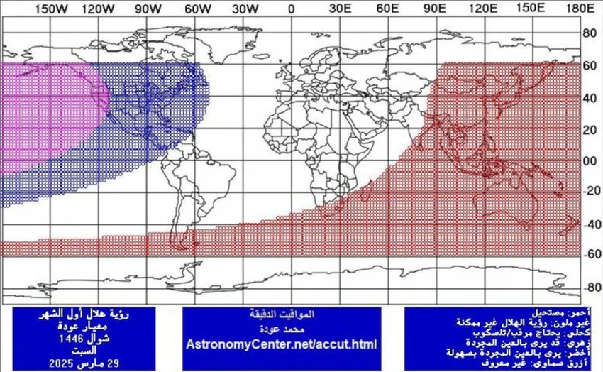 طقس العرب-قال المهندس محمد شوكت عودة مدير مركز الفلك الدولي أن معظم الدول ستتحرى هلال شهر شوال (عيد الفطر 1446 هـ) يوم السبت 29 مارس/آذار 2025م، ورؤية الهلال في ذلك اليوم مستحيلة من شرق العالم، وهي غير ممكنة من باقي مناطق العالم العربي والإسلامي باستخدام جميع وسائل الرصد بما في ذلك العين المجردة والتلسكوب وتقنية التصوير الفلكي أيضا، في حين أنها ممكنة باستخدام التلسكوب فقط من وسط وشمال القارة الأمريكيةـ مع كون الرؤية صعبة جدا من شرق القارة الأمريكية حتى باستخدام التلسكوب، ولا توجد إمكانية لرؤية الهلال بالعين المجردة إلا من مناطق المحيط الهادئ غرب الولايات المتحدة.