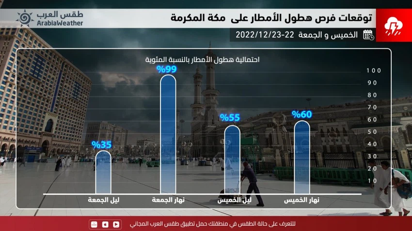 وتُشير آخر التوقعات لدينا في طقس العرب إلى أن فرص الأمطار يُتوقع أن تبدأ التقلبات الجوية بشكل تدريجي على مرتفعات مكة المكرمة والمشاعر المقدسة وسواحلها اعتباراً من ساعات نهار يوم الخميس، بحيث تتكاثر السحب وتتهيأ الفرصة لتساقط زخات من الأمطار ذات الشدة المتفاوتة في خلال ساعات الظهر والعصر، قد تترافق بالرعد أحياناً.