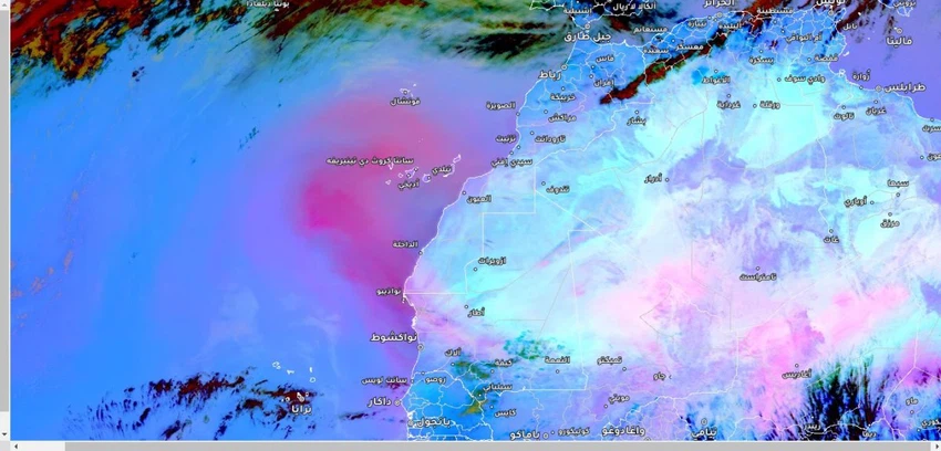 وترصد صور الأقمار الاصطناعية في مركز طقس العرب العاصفة الرملية الضخمة وهي تتمركز الآن قبالة سواحل المغرب العربي وتتوجه نحو مياه المحيط الأطلسي بمسار غير اعتيادي.