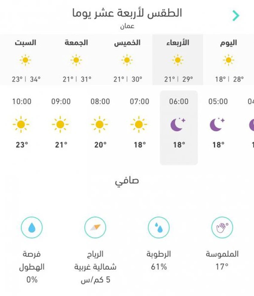 حالة الطقس ساعة بساعة وخلال فترات اليوم تجدونها داخل تطبيق طقس العرب، اضغط هُنا