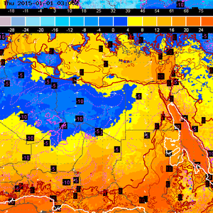 وستكون، بمشيئة الله، ذروة اتساع الأجواء الباردة ليلاً مع ليلة الجُمعة/ السبت، حيثُ ستنخفض درجات الحرارة ليلاً حول الصفر المئوي في أجزاء واسعة من الوطن العربي، ليشمل ذلك المناطق الجبلية والصحراوية من المغرب وصولاً إلى الجزائر وتونس وليبيا ومصر، إضافة إلى بلاد الشام والعراق وشمال السعودية.