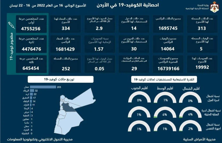 طقس العرب - أعلنت وزارة الصحة، عن تسجيل 5 وفيات و313 إصابة بفيروس كورونا في المملكة؛ خلال الأسبوع الوبائي رقم 16 لعام 2022 الممتد من 16 إلى 22 نيسان، ليرتفع العدد الإجمالي منذ بدء الوباء إلى 14064 وفاة و1695745 إصابة.