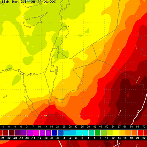 ويتضح من خلال خرائط النماذج العددية بأن الكُتلة الهوائية الباردة ستندفع نحو الحوض الشرقي للبحر المتوسط خلال ساعات مساء الجُمعة 26-9-2014، وهو ما سيعمل على تشكُل المُنخفض جوي إلى الجنوب الغربي من تركيا ومن ثم تحرك مركز المنخفض شرقاً إلى الشمال  من جزيرة قبرص يوم الأحد 28-9-2014.