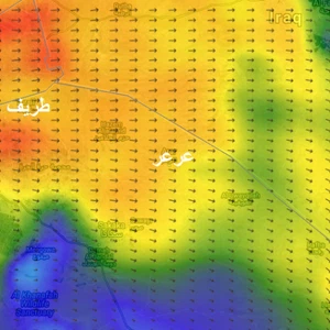 ويتوقع أن تبلغ سرعة الرياح بحدود 30-35 كم/ساعة، فيما تصل سرعة هبات الرياح الى 60-65 كم/ساعة في بعض الأحيان.