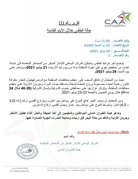 طقس العرب - سنان خلف - ضمن مراقتبها ومُتابعتها المستمرة لتطورات الطقس في السلطنة، أصدرت الهيئة العامة للأرصاد الجوية في سلطنة عُمان التقرير رقم 1 حول تفاصيل توقعات الأمطار خلال الايام القادمة، وفيما يلي نص التقرير: