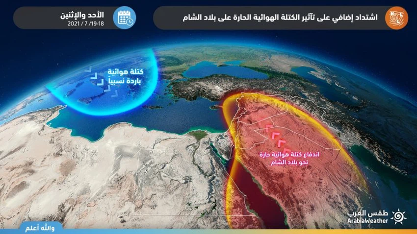 طقس العرب - من المتوقع أن يتزايد تأثر المملكة الأحد والاثنين بالكتلة الهوائية الحارة والجافة، لينعكس ذلك على الأرض برفع درجات الحرارة بشكل كبير ولافت، وسط مؤشرات على اقتراب العظمى يوم الاثنين من الـ 40 مئوية في العديد من المدن والمحافظات في بلاد الشام.