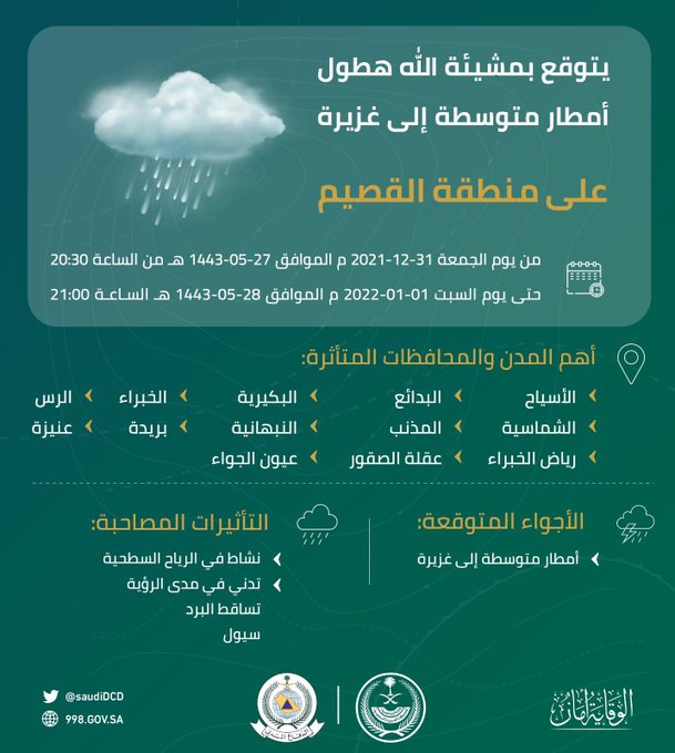 فرصة هطول أمطار متوسطة إلى غزيرة على منطقة #القصيم يشمل ( الأسياح، البدائع، البكيرية، الخبراء، الرس، الشماسية، المذنب، النبهانية، بريدة، عنيزة، رياض الخبراء، عقلة الصقور، عيون الجواء ) حتى الساعة 9 مساءً.