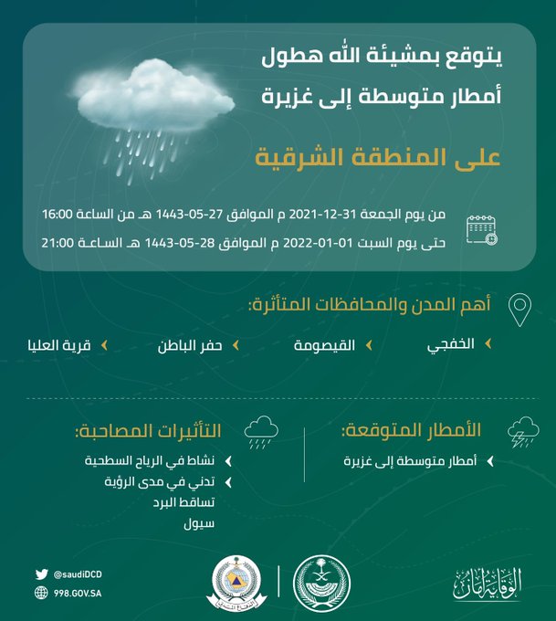 فرصة هطول أمطار متوسطة إلى غزيرة على المنطقة الشرقية يشمل ( الخفجي، القيصومة، حفر الباطن، قرية العليا ) حتى الساعة 9 مساءً .