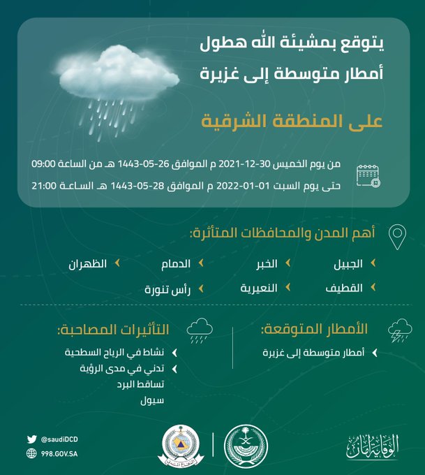 فرصة هطول أمطار متوسطة إلى غزيرة على المنطقة الشرقية يشمل ( الجبيل، الخبر، الدمام، الظهران، القطيف، النعيرية، رأس تنورة ) حتى الساعة 9 مساءً .