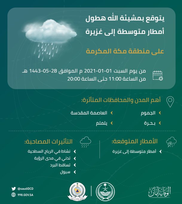 فرصة هطول أمطار متوسطة إلى غزيرة على منطقة #مكة_المكرمة يشمل ( الجموم، العاصمة المقدسة، بحرة، يلملم ) حتى الساعة 8 مساءً .
