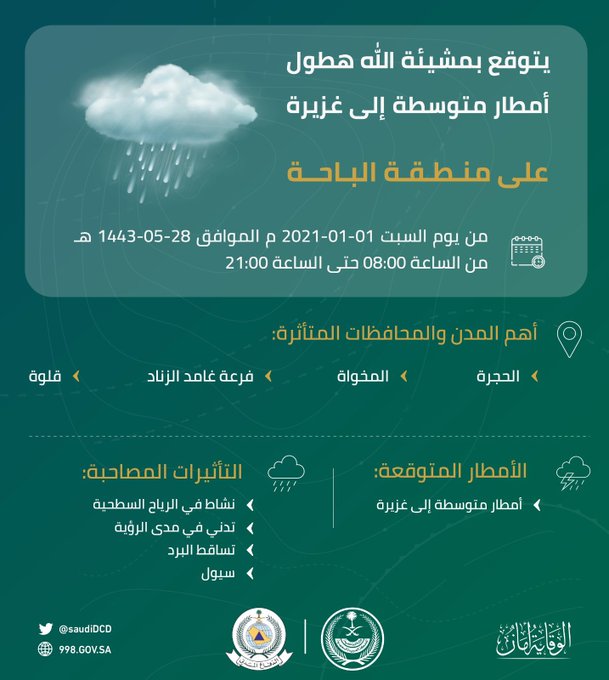 فرصة هطول أمطار متوسطة إلى غزيرة على منطقة الباحة يشمل ( الحجرة، المخواة، فرعة غامد الزناد، قلوة ) حتى الساعة 9 مساءً .