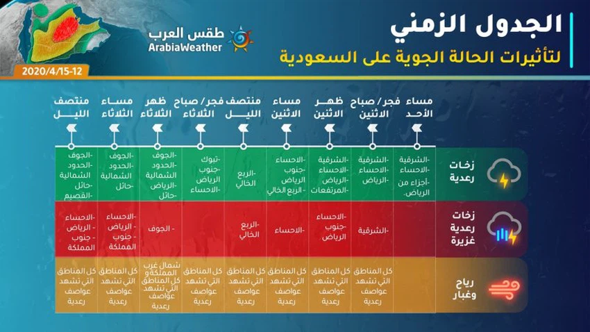 طقس العرب - سنان خلف - تتأثر المملكة العربية السُعودية اعتباراً من يوم الإثنين بأول حالة جوية ربيعية يُمكن وصفها بأنها الأقوى و الأكثر شمولية منذ بداية الربيع، بل وربما منذ بداية الموسم، تحمل في طياتها العديد من الظواهر الجوية، كالأمطار الغزيرة و العواصف الرعدية والرياح القوية وموجات الغبار، وفيما يلي تصميم يتضمن التسلسل الزمني للحالة الماطرة و المناطق الأكثر تأثراً بها