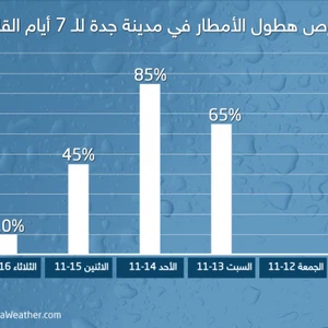 وحول تفاصيل الحالة الماطرة وتأثيراتها المُباشرة على مدينة جدة فيُتوقع أن تبدأ الأحوال الجوية غير المستقرة بالتأثر على مدينة جدة اعتباراً من ساعات صباح يوم السبت، على أن تتحسن فرص الأمطار بشكل اضافي يوم الأحد كما هو مُبين من خلال المخطط البياني المرفق: