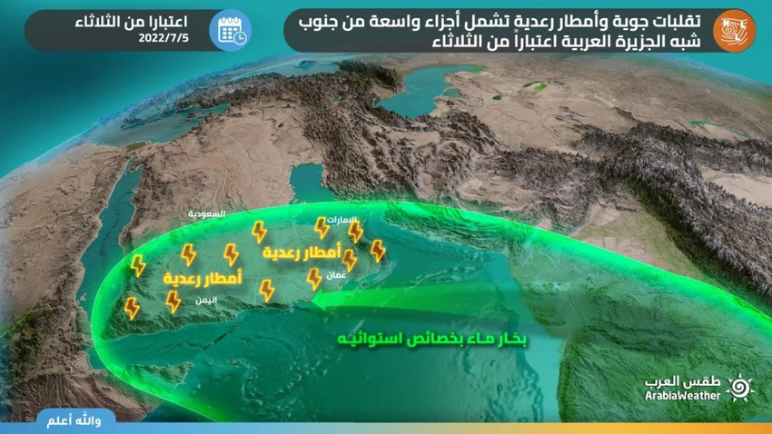 ويُتوقع ان تشهد دولة الإمارات تزايداً في تشكل السحب الرعدية الماطرة على المرتفعات الجبلية الشرقية من البلاد والمناطق المجاورة لها، وذلك بالتزامن تعمق بخار ماء بخصائص استوائية نحو المنطقة، قد تشمل مدينة العين والأجزاء الداخلية من دبي والشارقة وعجمان، وقد تمتد تأثيرات هذه السحب نحو بعض السواحل على شكل رياح هابطة وغبار.