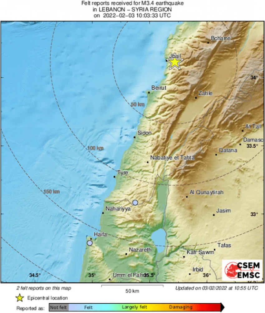 طقس العرب - سجل مركز الزلازل الأوروبي المتوسطي اليوم الخميس هزة أرضية بقوة 3.4 على مقياس ريختر يبعد مركزها 31 كم شمال شرق العاصمة اللبنانية بيروت، وذلك في الساعة 12:03 ظهرا بالتوقيت المحلي، وشعر بالهزة سكان بيروت وعدد من المناطق اللبنانية وشمال فلسطين.