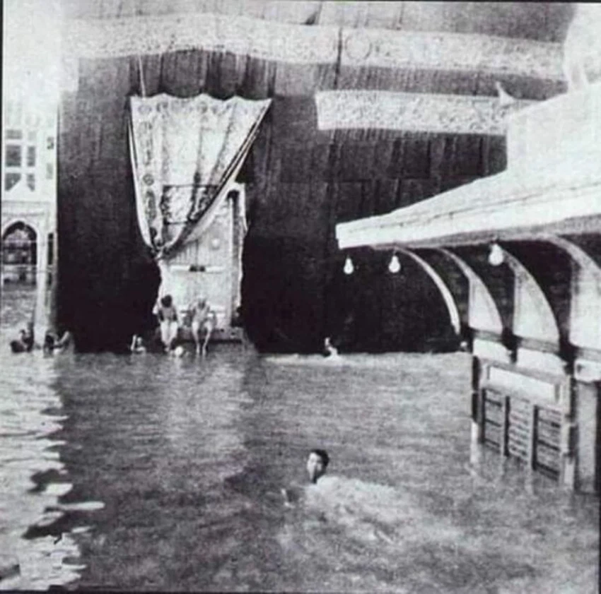 طقس العرب - قبل 83 عاماً، وبعد هطول أمطار غزيرة على مكة المكرمة، غمرت المياه صحن المطاف لأكثر من متر ونصف، حتى غطت الحجر الأسود، وفي تلك الظروف، قام الشاب البحريني علي العوضي بالطواف سباحة حول الكعبة، في مشهد نادر سجلته الصورة الملتقطة له عام 1941.