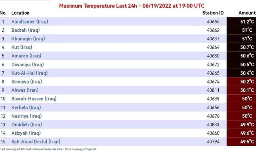 طقس العرب - هيمنة مناطق عراقية يوم الأحد 19/6/2022 على المراتب الثمانية الأولى في قائمة أعلى درجات حرارة على وجه الأرض، وخاصة في منطقة عين تمر التي تخطت الحرارة العظمى فيها حدود ال51 درجة مئوية.