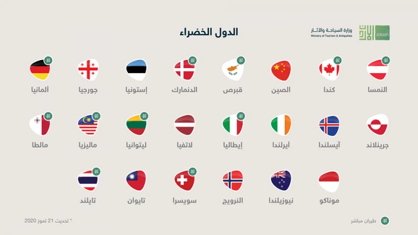 طقس العرب- أعلنت وزارة السياحة والاثار، الثلاثاء، عن قائمة الدول الخضراء التي تسمح الحالة الوبائية فيها لاستئناف الحركة الجوية مع الأردن.