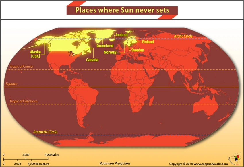 تسمى النرويج، الواقعة ضمن الدائرة القطبية الشمالية، بـ"أرض شمس منتصف الليل"، حيث لا تغرب الشمس فيها أبدًا في الفترة من مايو/ أيار إلى أواخر يوليو/ تموز، أي لمدة 76 يومًا تقريبًا، وفي منطقة سفالبارد بالنرويج، تشرق الشمس باستمرار من 10 أبريل/ نيسان إلى 23 أغسطس/ آب، و سفالبارد هي أقصى منطقة مأهولة بالسكان في شمال أوروبا.