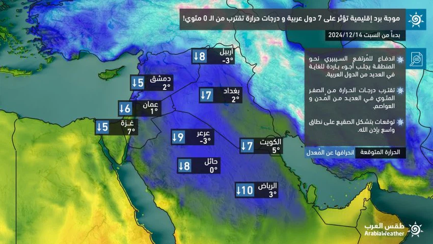 أشار المُختصون في مركز طقس العرب بأنه يُتوقع أن يندفع المُرتفع الجوي السيبيري نحو المنطقة خلال الأيام القادمة و يُرافقه كتلة هوائية شديدة البُرودة، تؤدي إلى انخفاض ملموس على درجات الحرارة في العديد من الدُول بما فيها 7 دول عربية مُتمثلة ببلاد الشام و العراق و السعودية و الكويت و يطال تأثيرها بشكل أضعف باقي الدول الخليجية و اليمن.
