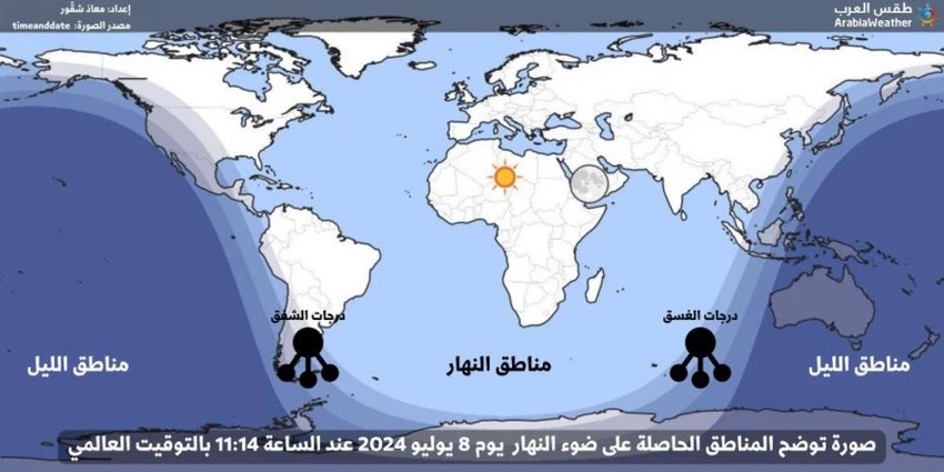 ما هو المميز في يوم 8 يوليو من كل عام؟ الاثنين الفائت بتاريخ 8 يوليو 2024 وعند الساعة 11:14 بالتوقيت العالمي، كان 99% تقريبا من سكان العالم تحت ضوء الشمس المباشر، أو من خلال التدرج الضوئي في مراحل الشفق والغسق حينما تكون الشمس تحت الأفق، لكن أشعتها ما تزال تضيء السماء، بينما كان البقية وهم سكان أستراليا ونيوزلندا وأجزاء من جنوب شرق آسيا والقارة القطبية الجنوبية في ظلام الليل (يعتمد هذا على عدد سكان العالم المتزايد يوما بعد يوم)، إنها لحظة فريدة بلا شك! التفسير العلمي لهذه الظاهرة: في هذه الوقت بتاريخ 8 يوليو من كل عام وما بين الساعة 11:00 و 11:15 بالتوقيت العالمي وفق دراسة أجراها موقع timeanddate، تكون معظم المناطق المأهولة بالسكان في العالم مواجهة للشمس، وفي مرحلة النهار أو الشفق والغسق الذي يعني ضوء النهار المنتشر بعد نزول الشمس تحت الأفق بغض النظر عن قوة أو ضعف الإضاءة، حيث يبدأ الفجر على سواحل أمريكا الشمالية الغربية بينما لا يزال الغسق مشاهدا في مناطق شرق وجنوب شرق آسيا، وهذا يشمل معظم قارة آسيا وبالتأكيد الدول الكبرى من حيث عدد السكان مثل الصين والهند والتي ترجح كفة الحاصلين على ضوء النهار بالإضافة إلى أوروبا وأفريقيا وأمريكا الشمالية وأمريكا الجنوبية، ولأن الشمس تتحرك قليلا نحو الجنوب بعد أن وصلت ذروة الشمال في موعد الانقلاب الصيفي، فإنها تضيف بحركتها هذه إلى مناطق النهار والغسق ملايين السكان في جنوب شرق آسيا في البلدان ذات الكثافة السكانية العالية. والصورة توضح كيفية توزيع ضوء النهار (الشمس) والغسق (أول الليل) والشفق (أول النهار) في ذلك اليوم.