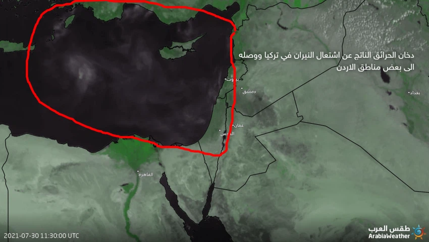 طقس العرب - رصدت صور الاقمار الاصطناعية التابعة الى طقس العرب كتلة ضخمة من دخان الحرائق المشتعله في الأراضي التركية واللبنانية، وينتشر دخان الحرائق في الحوض الشرقي للبحر الأبيض المُتوسط وصولاً إلى بعض مناطق الأردن من خلال طبقات الجو العليا، ويمكن رؤيتها بالعين المُجردة من خلال النظر للسماء في الأفق الغرب