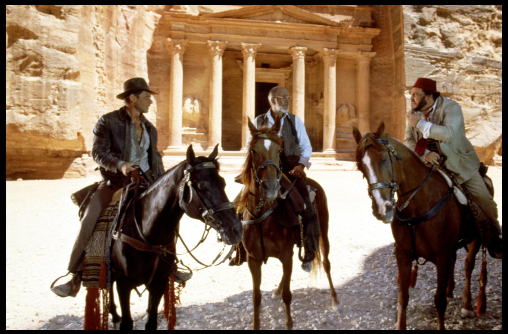 تم تصوير اجزاء من مشاهد الفيلم في مدينة البترا عندما كان بدو انديانا يبحث عن الكأس المقدسة، وتوجه برحلته الى وادي القمر والمعبد المقدس، وفاز الفيلم بجائزة الاوسكار وحقق ايرادات تجاوز الـ 474 مليون دولار.