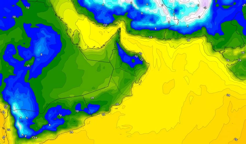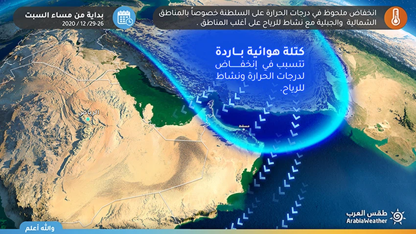 طقس العرب - كأول موجات البرد لهذا الشتاء يتوقع أن تتأثر سلطنة عُمان بكتلة هوائية باردة شمالية مصحوبة برياح نشطة وشديدة أحياناً تعمل على ارتفاع أمواج البحر على عموم السواحل، وتزيد من الإحساس بالبرودة، حيث يتوقع أن تترواح درجات الحرارة الصغرى على المناطق الساحلية بحدود 18-13 درجة مئوية، فيما تصل درجات الحرارة على المرتفعات والمناطق الجبلية إلى ما دون ال10 درجات مئوية، مع فرص عالية لتشكل الصقيع على القمم الشاهقة.
