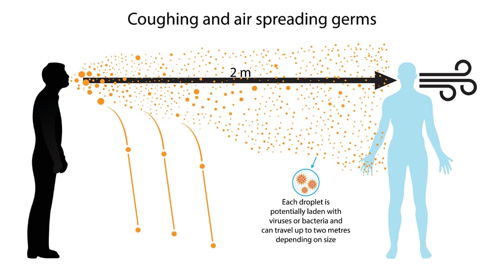 عندما نعطس أو نسعل، تخرج قطرات من أفواهنا بأحجام مختلفة، فكر في الأمر وكأنك غمست فرشاة في الطلاء ثم دفعتها للأمام بقوة هائلة، إذا كنت ستفعل هذا في غرفة بيضاء، ستلاحظ نمطًا مبعثرًا من الطلاء يلطخ الجدران والأرضية.
