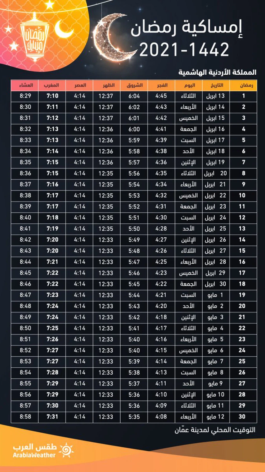 وفيما يلي إمساكية شهر رمضان 2021 في الأردن بحسب التوقيت المحلي للعاصمة عمّان.