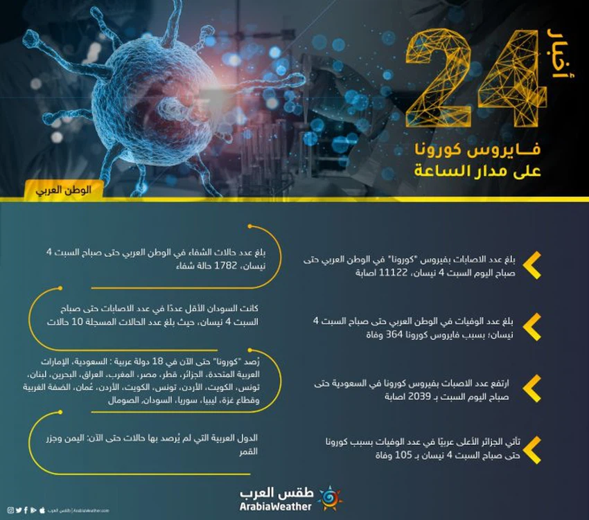 طقس العرب - بلغ عدد الاصابات في الوطن العربي 11122 حتى صباح اليوم السبت 4/4/2020، فيما بلغ عدد المتعافين 1782 حالة شفاء،في لوقت الذي تجاوزت في عدد الاصابات عالميًا حاجز المليون، يث بلغ عدد الاصابات 1129425