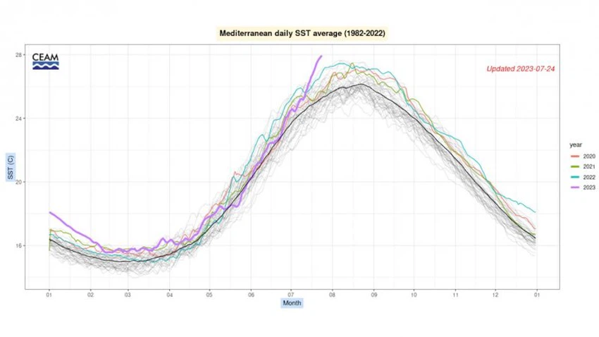 و تسببت هذه الموجة إلى ارتفاع درجة حرارة مسطح البحر الأبيض المُتوسط عن من مُعدلاته المُعتادة بأكثر من 5 درجات مئوية و بخاصة في الجزء الأوسط منه.
