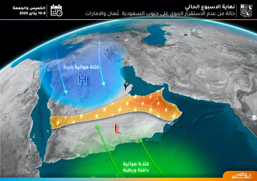 طقس العرب- تشير آخر المخرجات الحاسوبية المستلمة لدى العرب إلى اشتداد حالة عدم الاستقرار الجوي على جنوب غرب السعودية مع نهاية الاسبوع الحالي بسبب اندفاع كتلتين هوائيتين إحداهما باردة قادمة من الشمال و الأخرى دافئة ورطبة قادمة من بحر العرب ستعملان على نشوء حالة من عدم الاستقرار الجوي على المرتفعات الجنوبية الغربية من السعودية و منطقة الربع الخالي يومي الخميس و الجمعة.