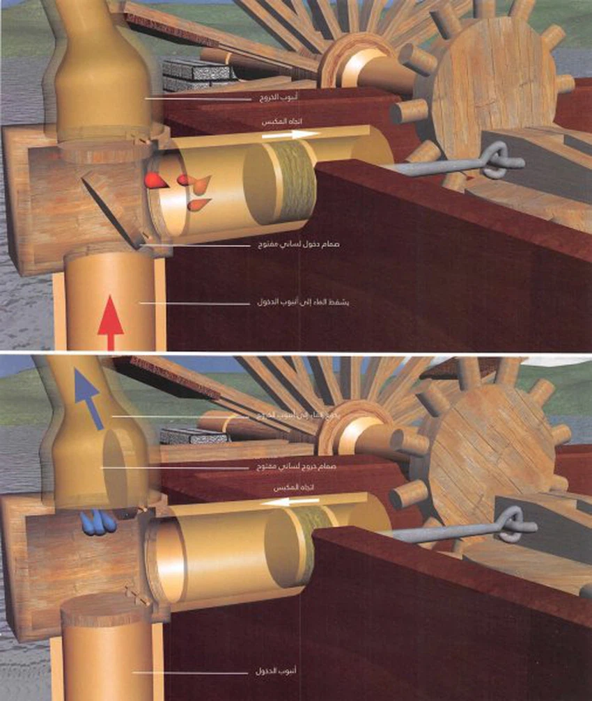 تمثل مضخة الجزري تغيرًا جذريًّا في تقنيات رفع الماء، إذ كانت تقوم عجلة تدور بقوة المياه بتدوير ترس عمودي يقوم بدوره بتدوير عجلة أفقية تتسبب في تذبذب مكبسين متقابلين، وتتصل أسطوانات المكبسين بأنابيب الامتصاص والتصريف؛ بحيث تقوم أنابيب الامتصاص بسحب المياه من حوض موجود بالأسفل في حين تصرف أنابيب التصريف المياه إلى نظام الإمداد الواقع على علو 12 مترًا فوق الآلة. وتعد هذه المضخة نموذجًا أوليًّا لمبدأ ازدواج الفعل (سحب الماء وتصريفه)، وكانت المضخة قادة على رفع 13.6 متر من الماء بمساعدة أنابيب التوصيل. كان هذا أكثر تطوراً من مضخات الشفط التي ظهرت في أوروبا في القرن الخامس عشر، والتي كانت تفتقر إلى أنابيب التوصيل.