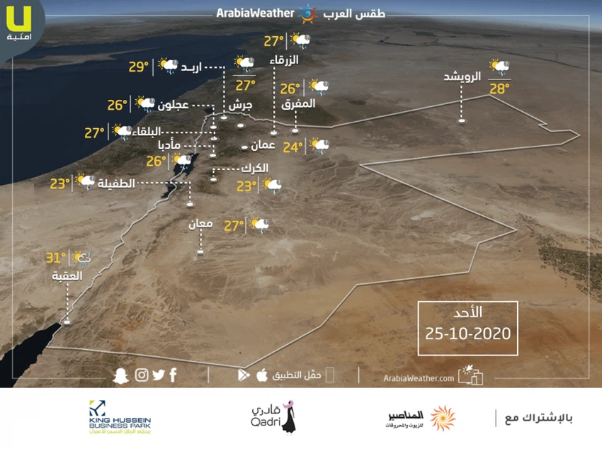 درجة الحرارة العظمى المتوقعة في الكرك: °23