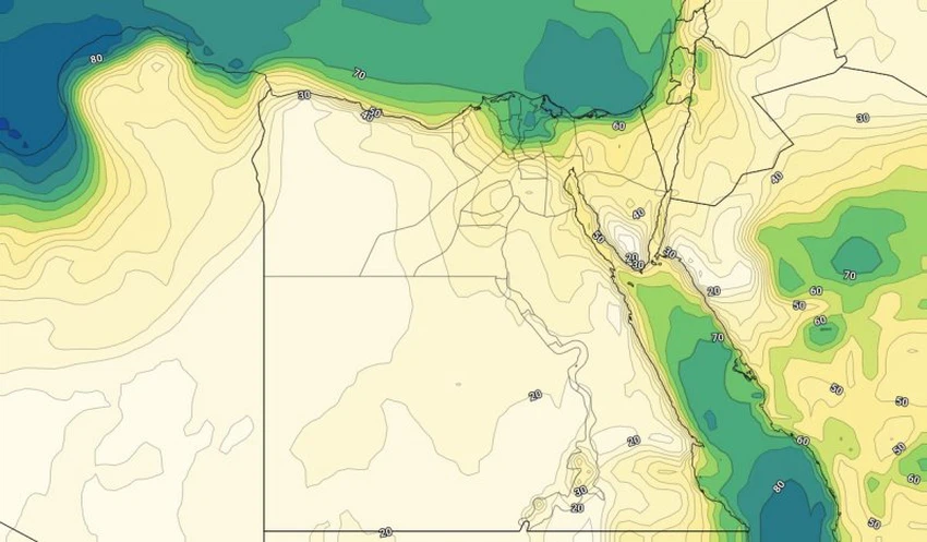 وتزداد نسب الرطوبة السطحية على أجزاء من شمال مصر وعلى الدلتا مع ساعات الصباح مما قد يعمل على تشكل الضباب الخفيف على أجزاء محدودة من القاهرة والدلتا والقناة وشمال سيناء.