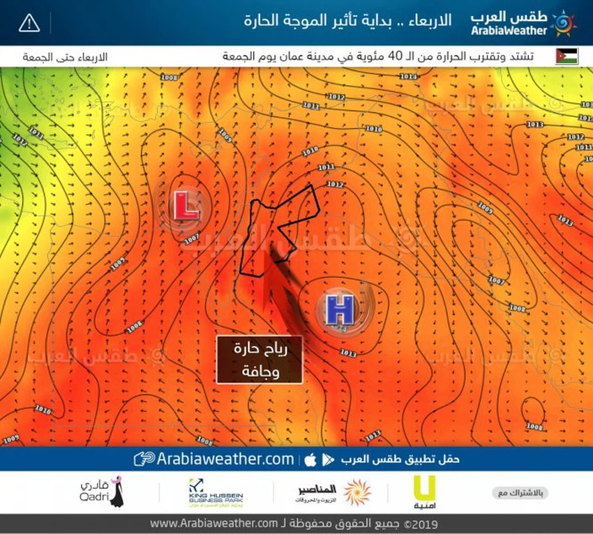 طقس العرب – م. ناصر حداد – يتزايد تأثير الموجة الحارة الاولى على المملكة اعتبارا من الأربعاء 22 أيار 2019، لتصل ذروتها يوم الجمعة، وسط توقعات باقتراب درجات الحرارة من حاجز الـ 40 مئوية في بعض المناطق من ضمنها مدينة عمان.
