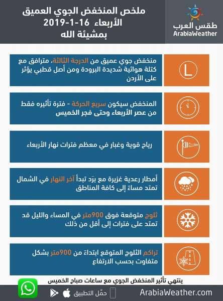 • أمطار غزيرة تبدأ بالهطول بمشيئة الله بدءاً من المناطق الشمالية، سُرعان ما تمتد مع ساعات المساء لتشمل معظم مناطق المملكة. هذه الأمطار تترافق على فترات مع حدوث العواصف الرعدية و تساقط لزخات غزيرة من البَرَد.