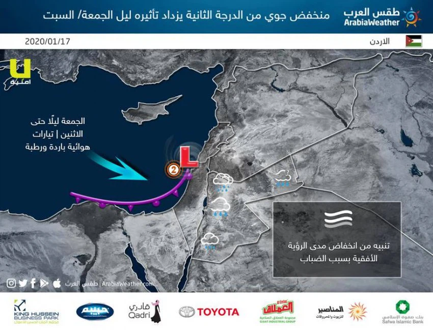 طقس العرب - سنان خلف - تتأثر المملكة في هذه الاثناء بمقدمة لمنخفض جوي صُنف كمنخفض من الدرجة الثانية بحسب مقياس طقس العرب لشدة المُنخفضات الجوية، وتشهد بعض المناطق بما فيها العاصمة عمّان في هذه الأثناء تساقط لزخات من الأمطار>