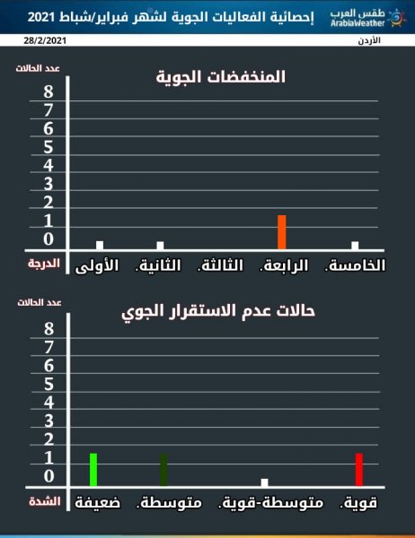 3-4/فبراير/2021 حالة قوية وشاملة من عدم الاستقرار الجوي : تأثرت المملكة مساء يوم الثلاثاء 3 فبراير باول حالة قوية وشاملة من عدم الاستقرار في الموسم، بدأت من جنوب وجنوب شرق المملكة على شكل امطار رعدية شملت مدينة العقبة، وبلغت حالة عدم الاستقرار ذروتها يوم الاربعاء 4 فبراير حيث عمت السُحب الرعدية كافة مناطق المملكة، وهطلت الأمطار التي كانت رعدية وغزيرة ومصحوبة بتساقط زخات كثيفة من البَرَد وشملت الهطولات بما في ذلك العاصمة عمان، كما عملت حالة عدم الاستقرار الجوي على :