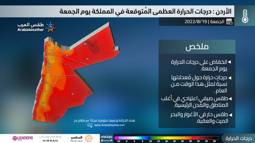 وفي التفاصيل، تنخفض درجات الحرارة في عموم مناطق المملكة يوم الجمعة لتُصبح حول مُعدلاتها المُعتادة نسبةً لمثل هذا الوقت من العام بإذن الله، وتسود أجواء صيفية اعتيادية في مُختلف المناطق تميل للحرارة قليلاً ساعات العصر، في حين تكون حارة في مناطق الأغوار والبحر الميت والعقبة والمناطق الصحراوية، وتكون الرياح شمالية غربية مُعتدلة السرعة، تنشط أحياناً خاصةً مع ساعات العصر والمساء.