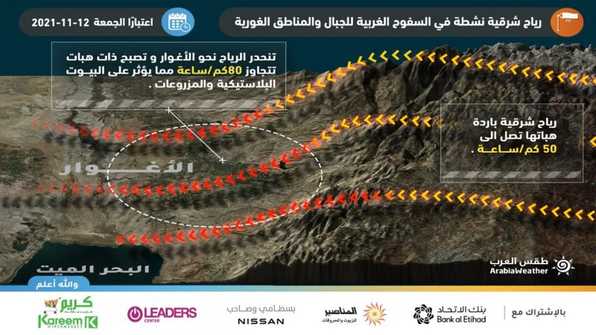 يُتوقع بمشيئة الله هبوب رياح شرقيه إلى جنوبية شرقية مُعتدلة لنشطة السرعة، تصحب الرياح الشرقية النشطة نهاية الأسبوع بهبات قوية تتجاوز حاجز ال50كم/ساعة خاصة مع يوم السبت، لاسيما في المرتفعات الجبلية والمناطق الشفا غورية، مما يتسبب بزيادة الشعور بالبرودة، واثارة الاتربة والغُبار في المناطق الصحراوية والمكشوفة.
