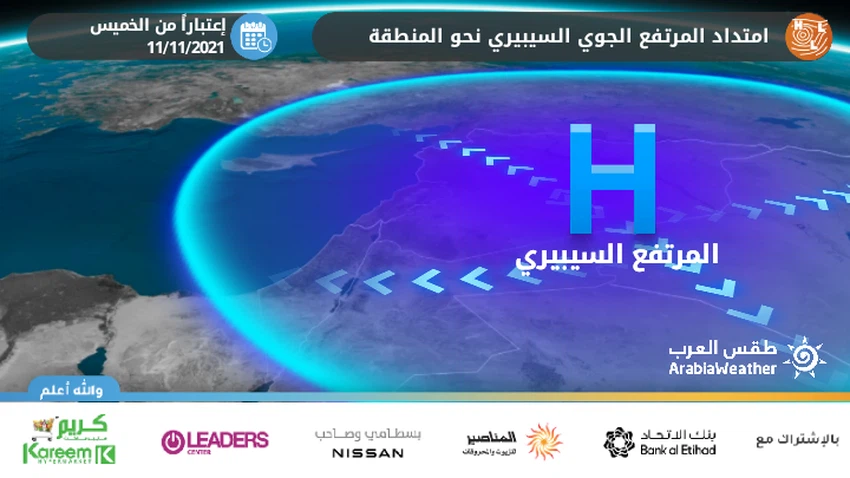 طقس العرب - تشير الخرائط الجوية في مركز طقس العرب الإقليمي إلى أن المملكة و إعتباراً من يوم الخميس ستتأثر بامتداد لما يسمى بالمرتفع الجوي السيبيري و ذلك لاول مرة هذا الموسم، ويُتوقع على إثر ذلك أن يطرأ انخفاض ملحوظ على درجات الحرارة لتصبح أبرد من مُعدلاتها نسبةً لهذا الوقت من العام، ويتحول الطقس ليصبح مائلاً للبرودة نهاراً في العديد من المناطق خاصة فوق المرتفعات الجبلية العالية، ومُعتدلاً في الأغوار والبحر الميت ومدينة العقبة مع ظهور السُحب على ارتفاعات مُتوسطة وعالية في بعض المناطق.